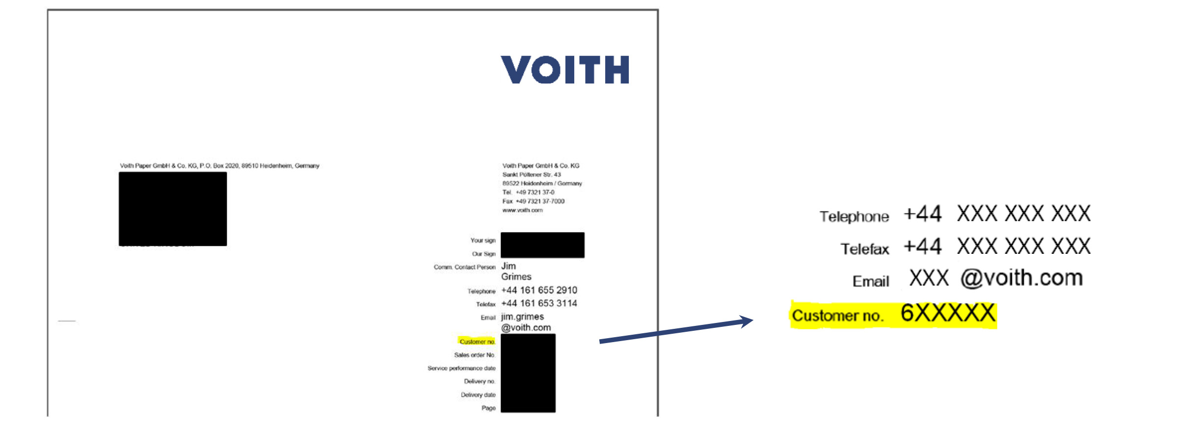 How to find the customer number on a Voith invoice